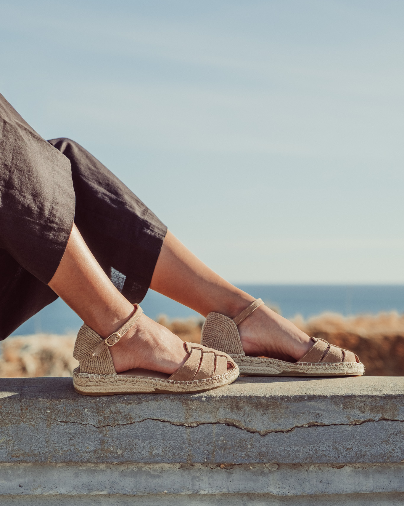 Descubre la sandalia ideal para tus días de sol. Este modelo combina la comodidad de una suela de yute con un diseño de tiras tejidas que envuelve el pie con elegancia y frescura. El delicado cierre de hebilla en el tobillo te ofrece un ajuste perfecto, haciendo de estas sandalias el calzado imprescindible para tus paseos por la playa o la ciudad.
