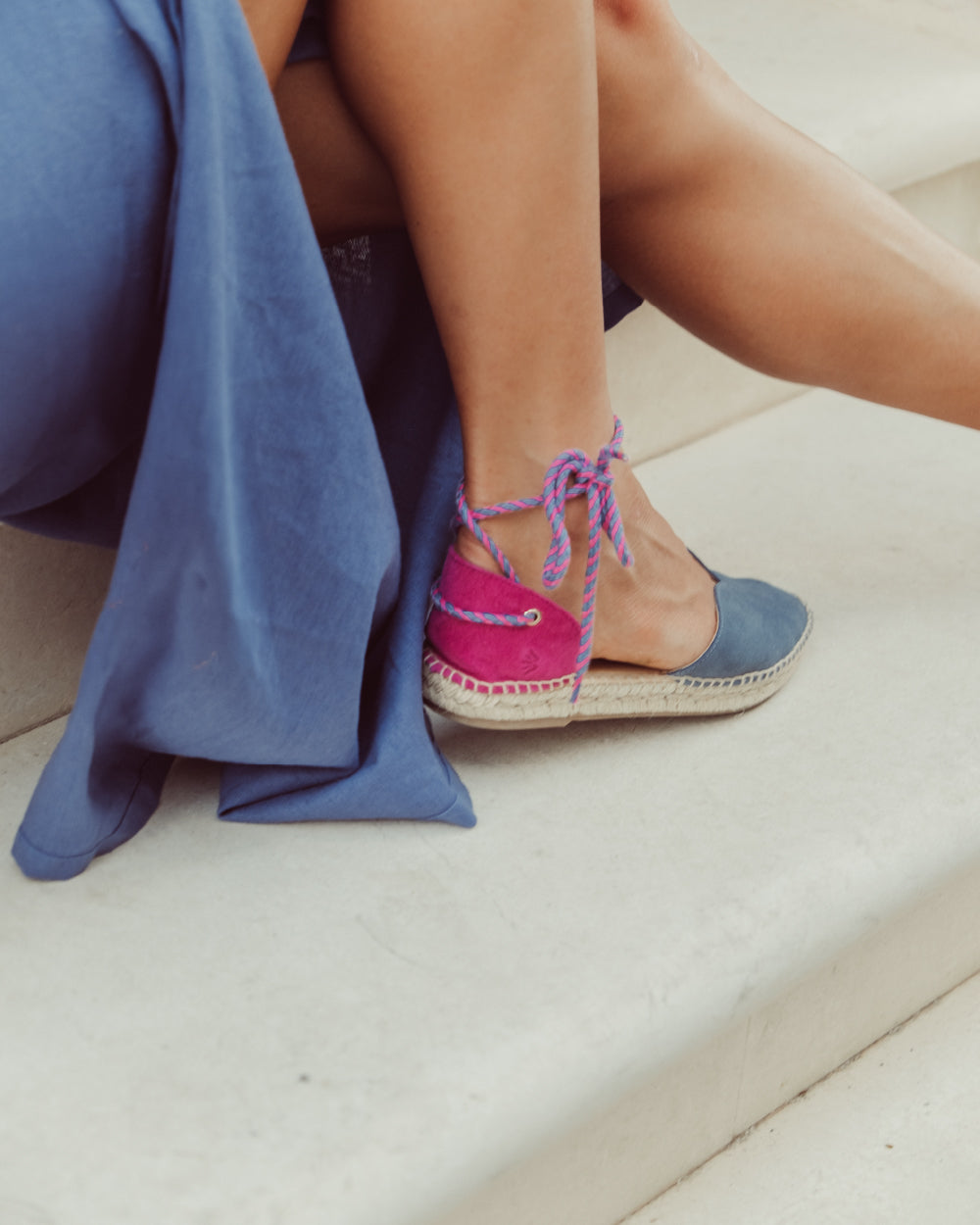 ¡Vuelve nuestro Santorini pero ahora en color azul / fucsia! Esta alpargata con escote en el puntilla es el favorito de muchas. Su estilo clásico pero a la vez elegante podrá vestir tus looks tanto playeros como para salir a comer las noches de verano! ¿Ya estás enamorada?