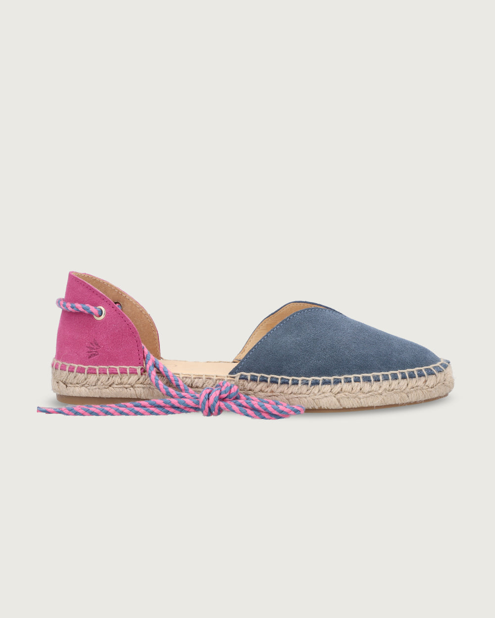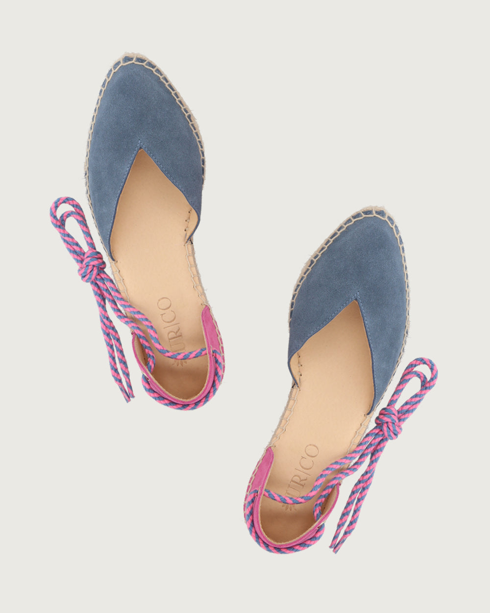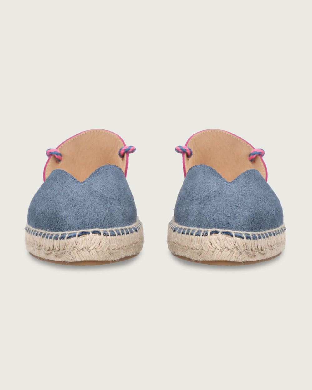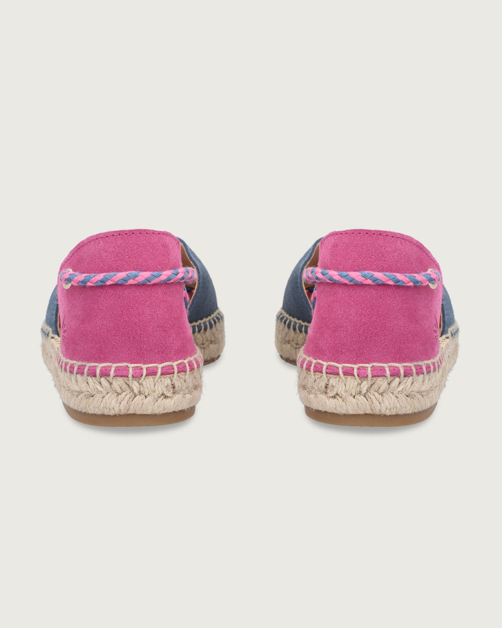 Alpargata de cuero gamuzado color azul y fucsia con escote en puntilla.