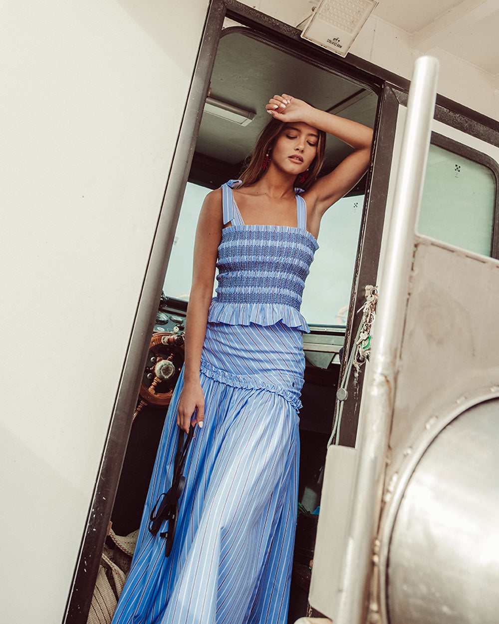 Falda Tropea midi de algodón celeste con líneas blancas y rojas, suelta, con vuelo y apertura en pierna, falda sostenible Chile.