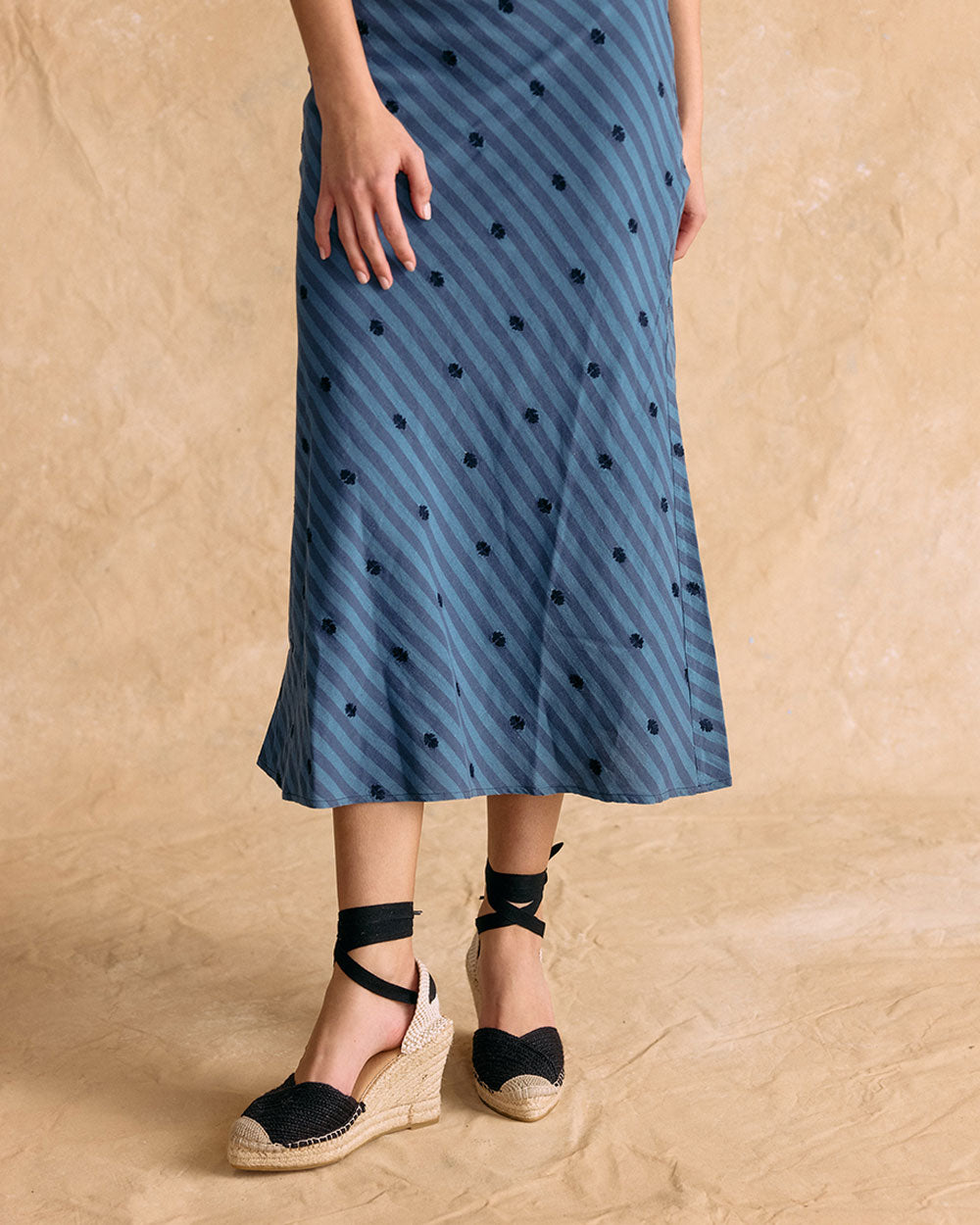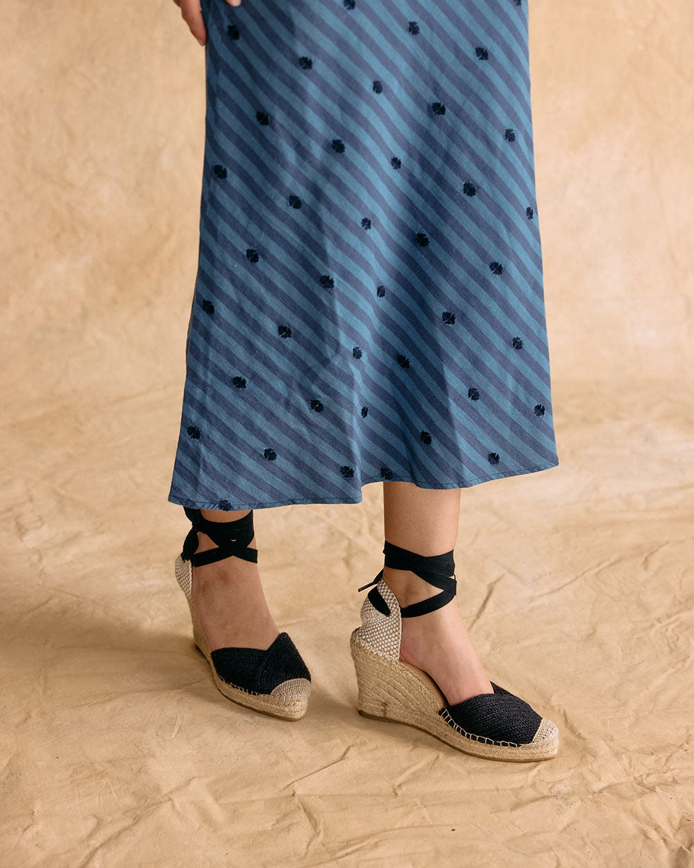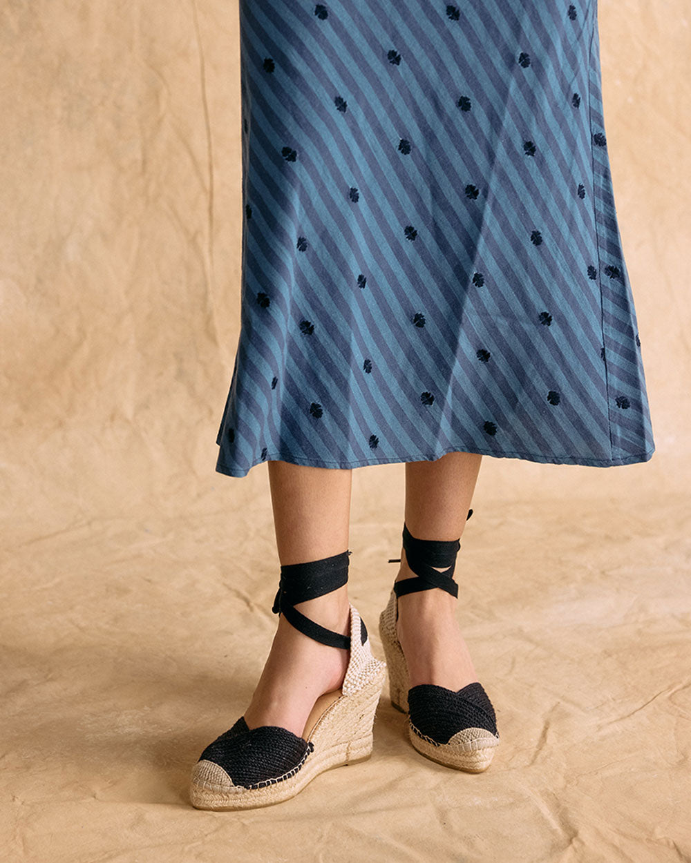 Descubre la Cuña Vera, la alpargata que captura la esencia del verano. Confeccionada con un tejido de acabado natural, este modelo destaca por sus delicadas cintas que se anudan con gracia alrededor de la pierna. Su cómoda cuña de yute trenzado no solo te brinda altura, sino que también te ofrece la elegancia atemporal de un diseño clásico.