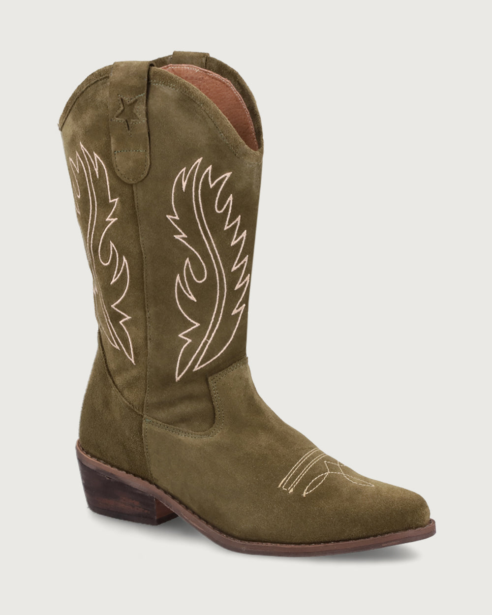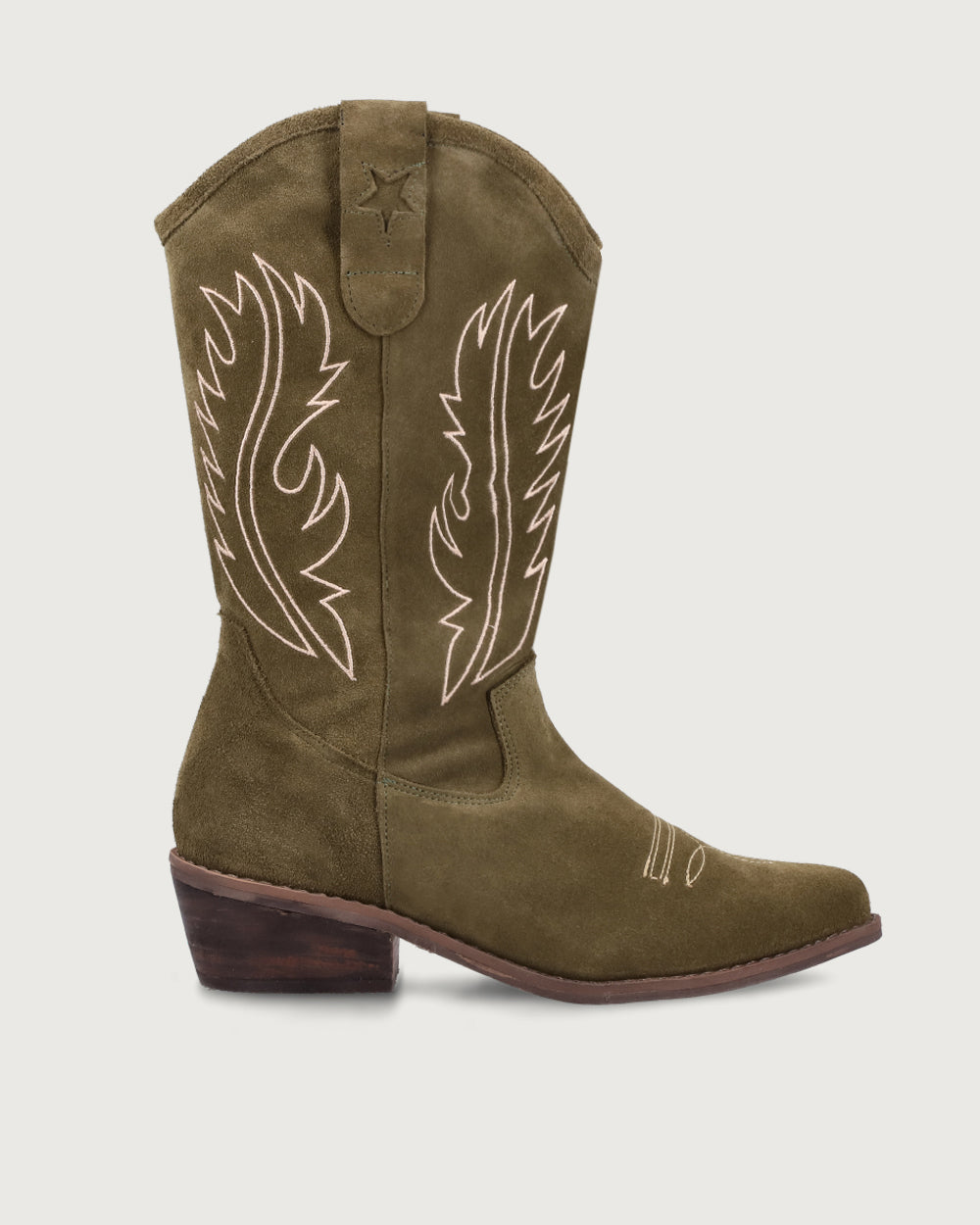 Bota vaquera de cuero gamuzado color oliva con bordado en los costados.