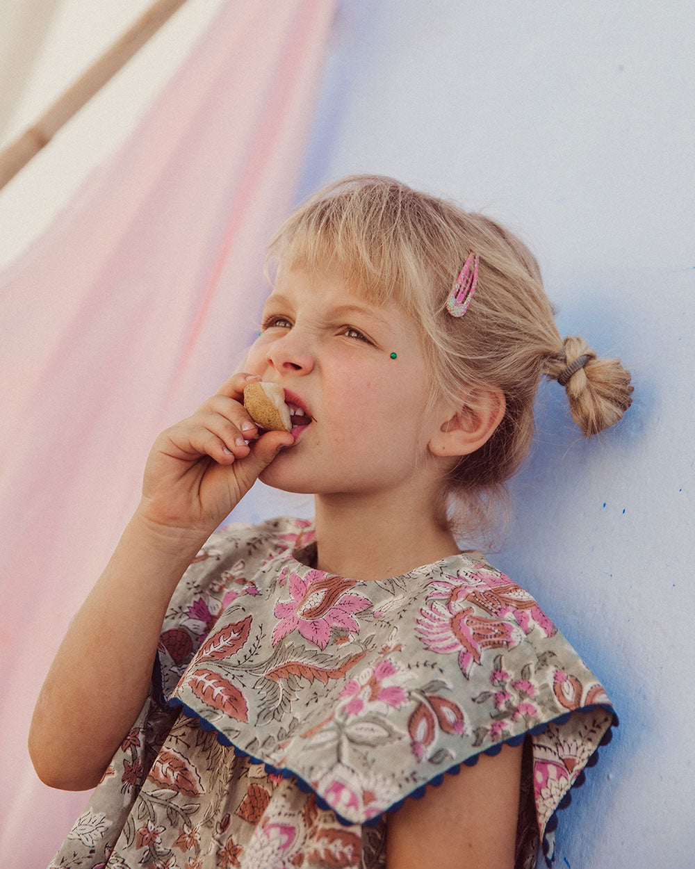 El Vestido Aurora es la pieza más cómoda y llamativa para el día a día de tu niña. Con su vibrante Print y su corte suelto, le da un look muy alegre y con estilo. Es perfecto para jugar y moverse sin parar, ya que es súper fresco y liviano.