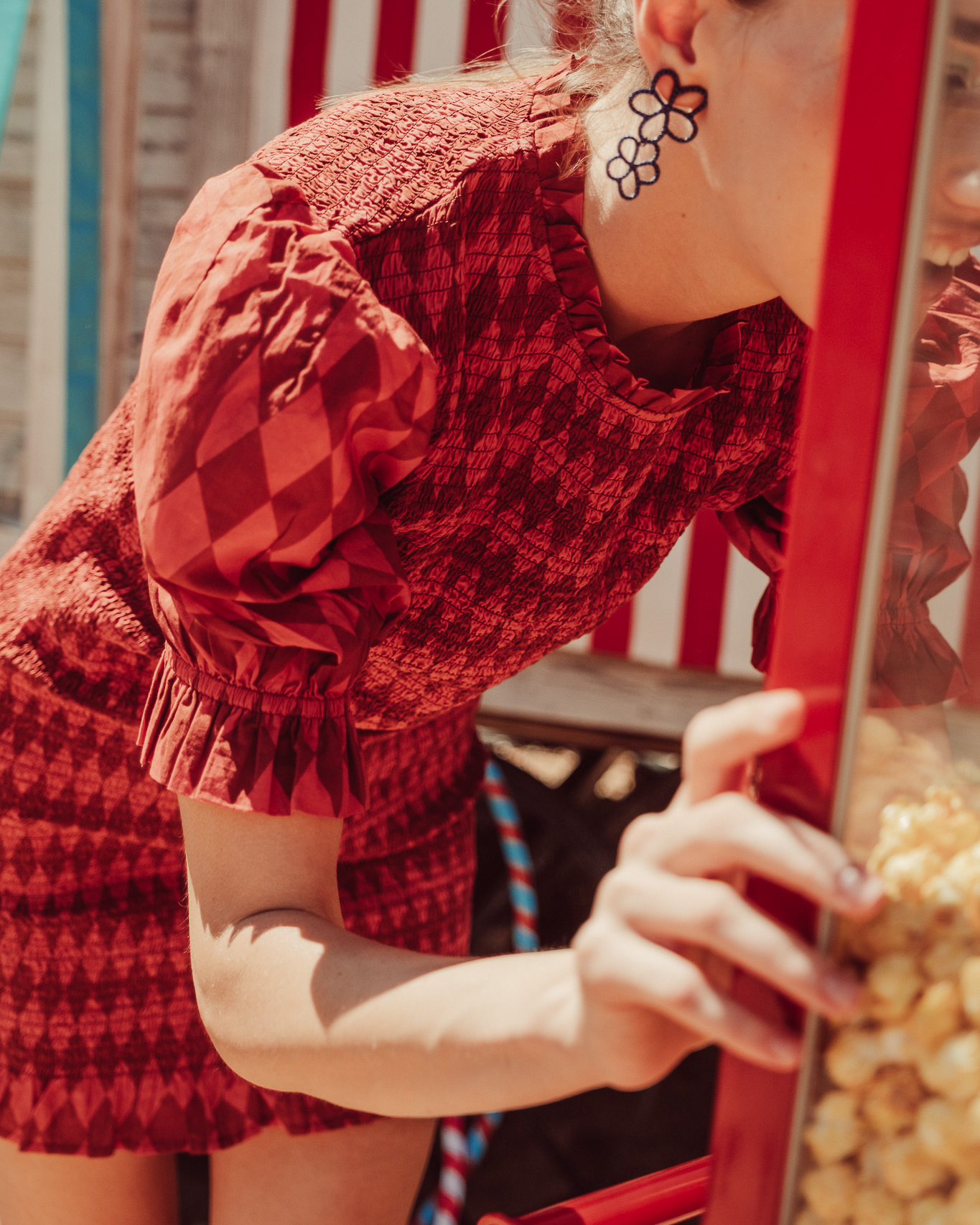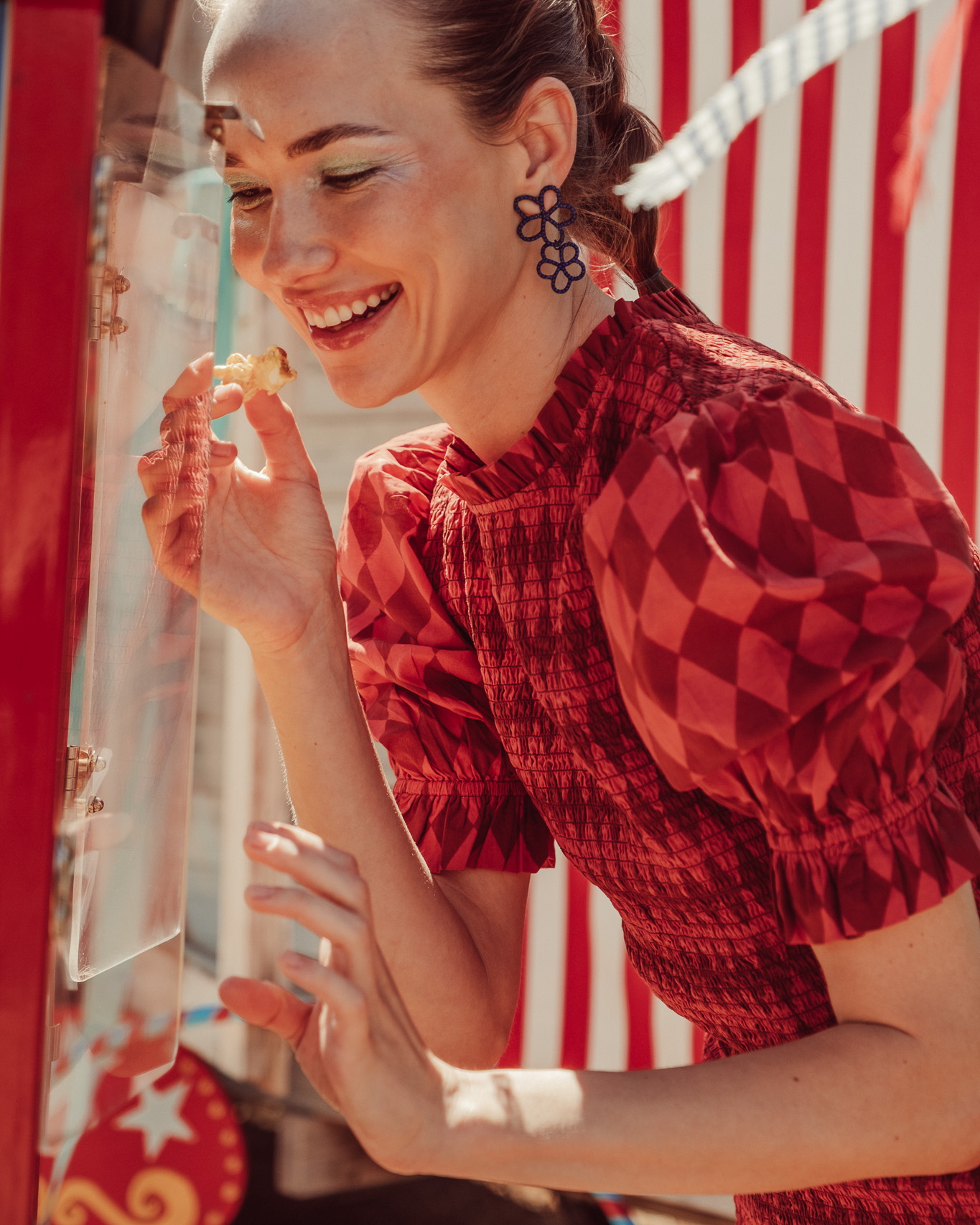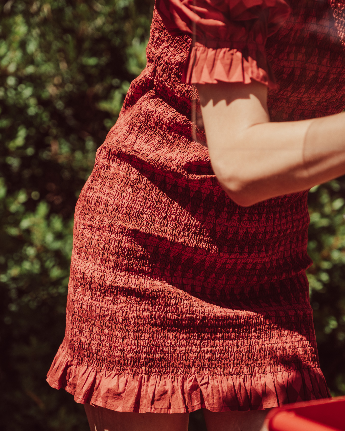 Nuestro vestido Dalia es un vestido mini que se destaca por su con panal de abeja, mangas englobadas, su estilo distinguido y un exclusivo estampado que le da un toque único. Es perfecto tanto para el día a día como para una ocasión especial.