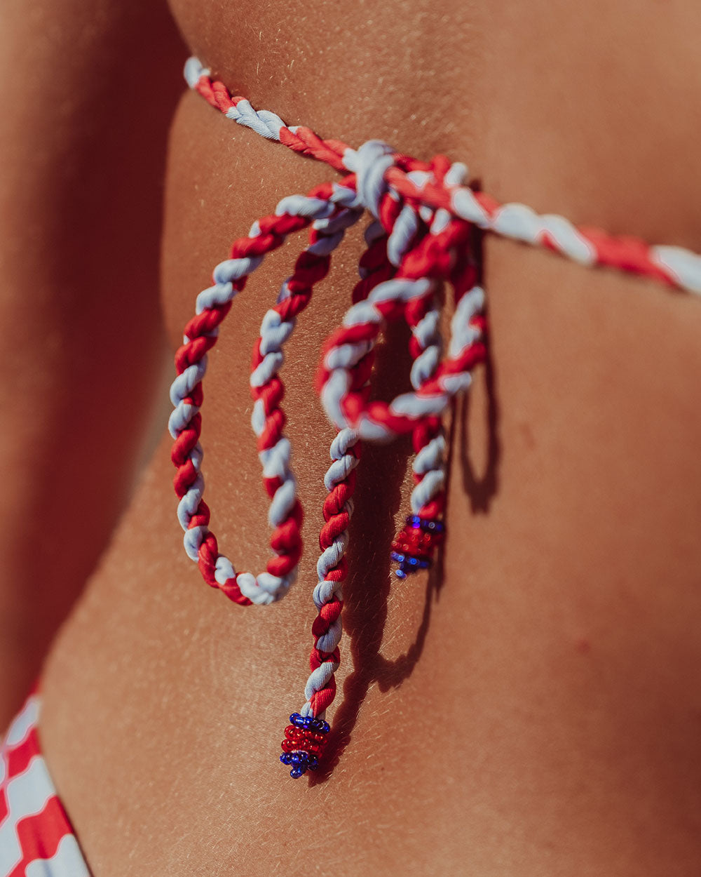 Top de triangulo con tiras trenzadas y mostacillas en las puntas le dan un toque especial a este bikinil. Es perfecto para ajustar el busto a tu medida.
