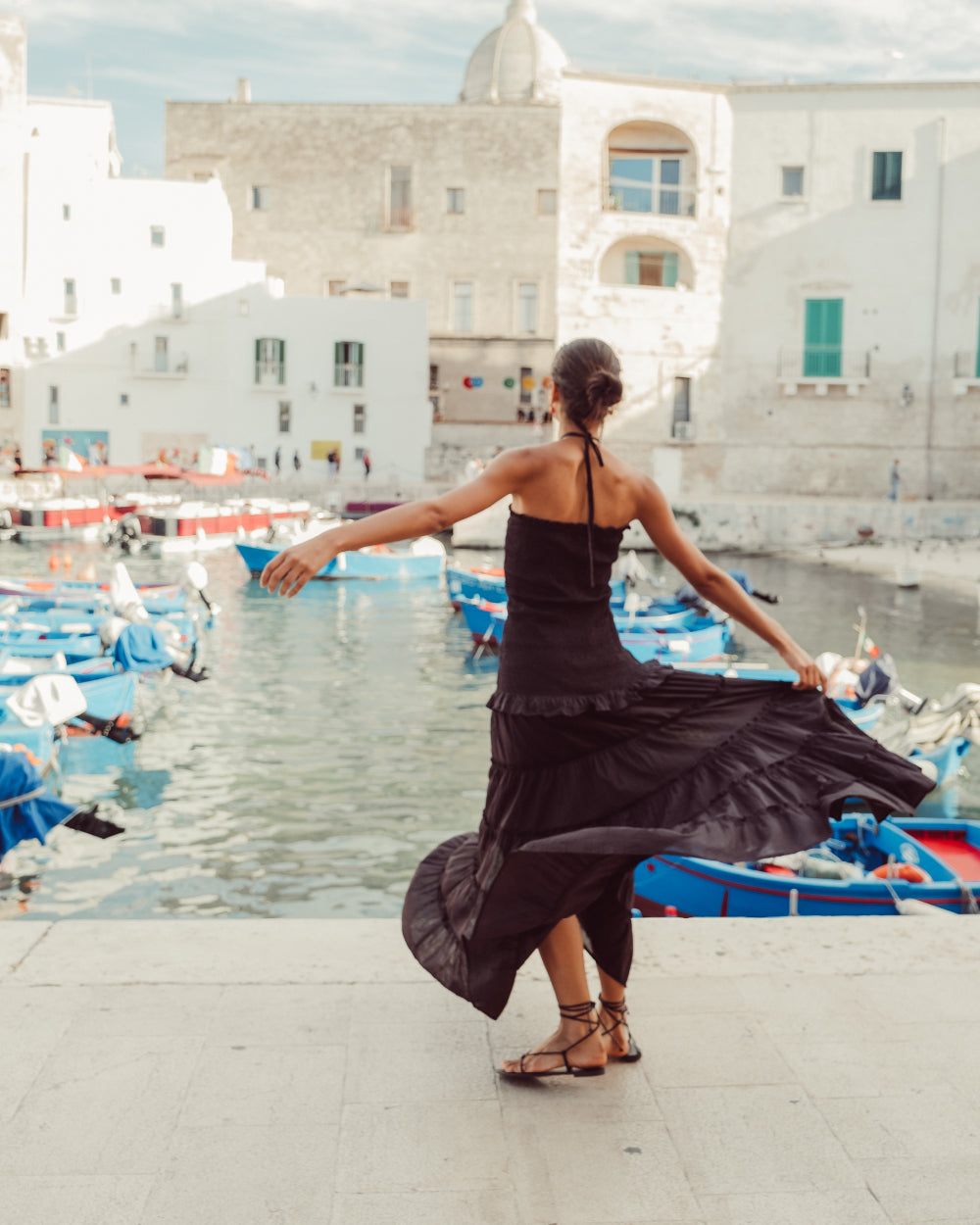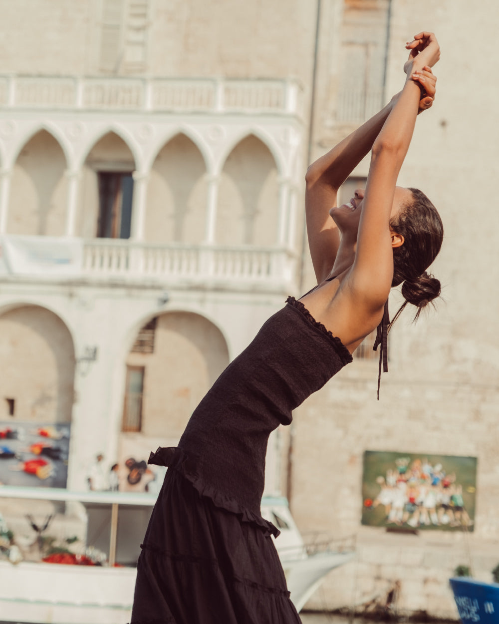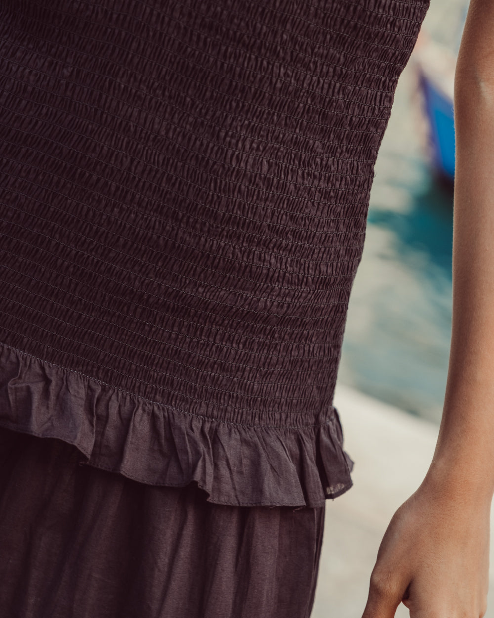 El vestido Garda, con su textura de panal de abeja, tiene un diseño largo y elegante, con tiras para amarrar al cuello que aportan un toque único. Su corte favorecedor y cómodo lo hace perfecto para lucir bien en cualquier momento, ideal para ocasiones especiales como bodas o eventos importantes.